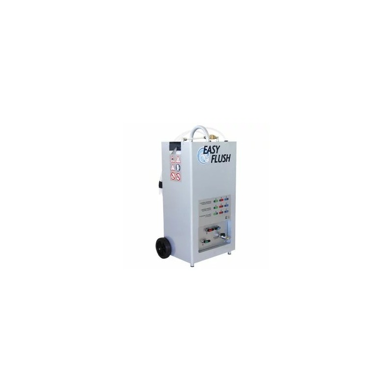 Mobilne urządzenie do płukania układów klimatyzacji z 20-litrowym zbiornikiem na płyn, możliwością podłączenia butli azotowej, zestawem adapterów i filtrów wielokrotnego użytku. Wyposażone w przepływomierz, przewody 3 m (1/4, 3/8, 1/2 SAE), zasilanie 230 V. Kompaktowe i łatwe w transporcie (na kołach), waga 19 kg.
