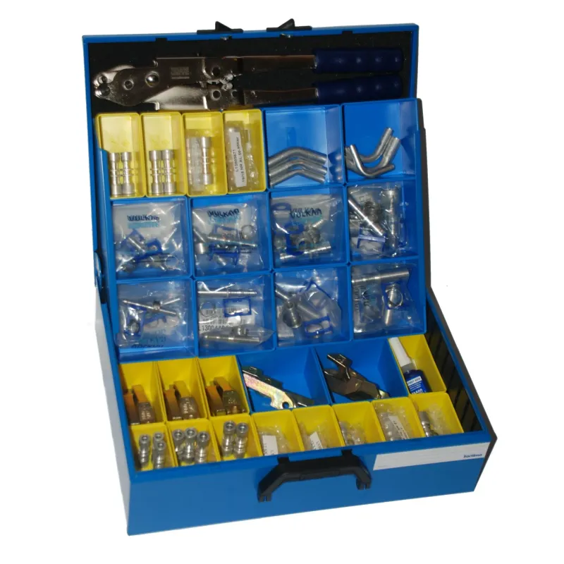Walizkowy, zestaw startowy SK-VAC-01 przeznaczony jest do połączeń Lokring w klimatyzacji samochodowej. W zestawie znajdują się wszystkie niezbędne narzędzia i złączki do napraw przewodów gumowych i/lub rur aluminiowych.